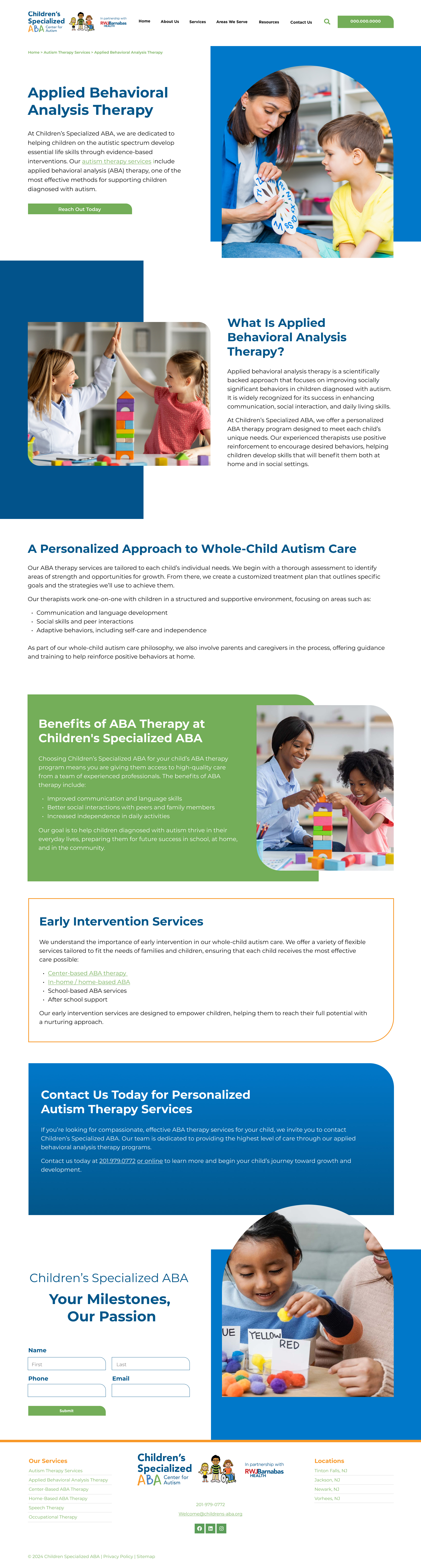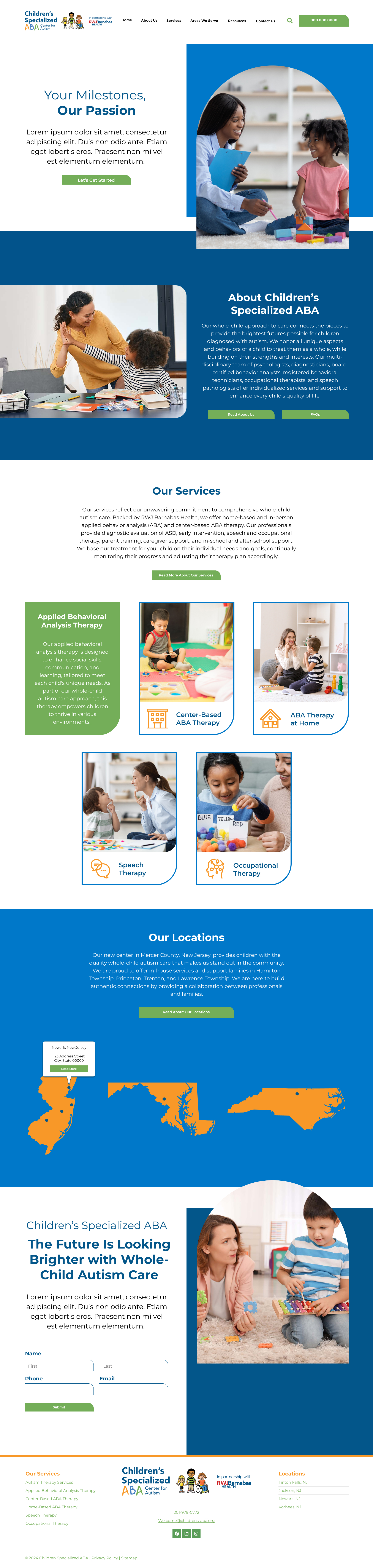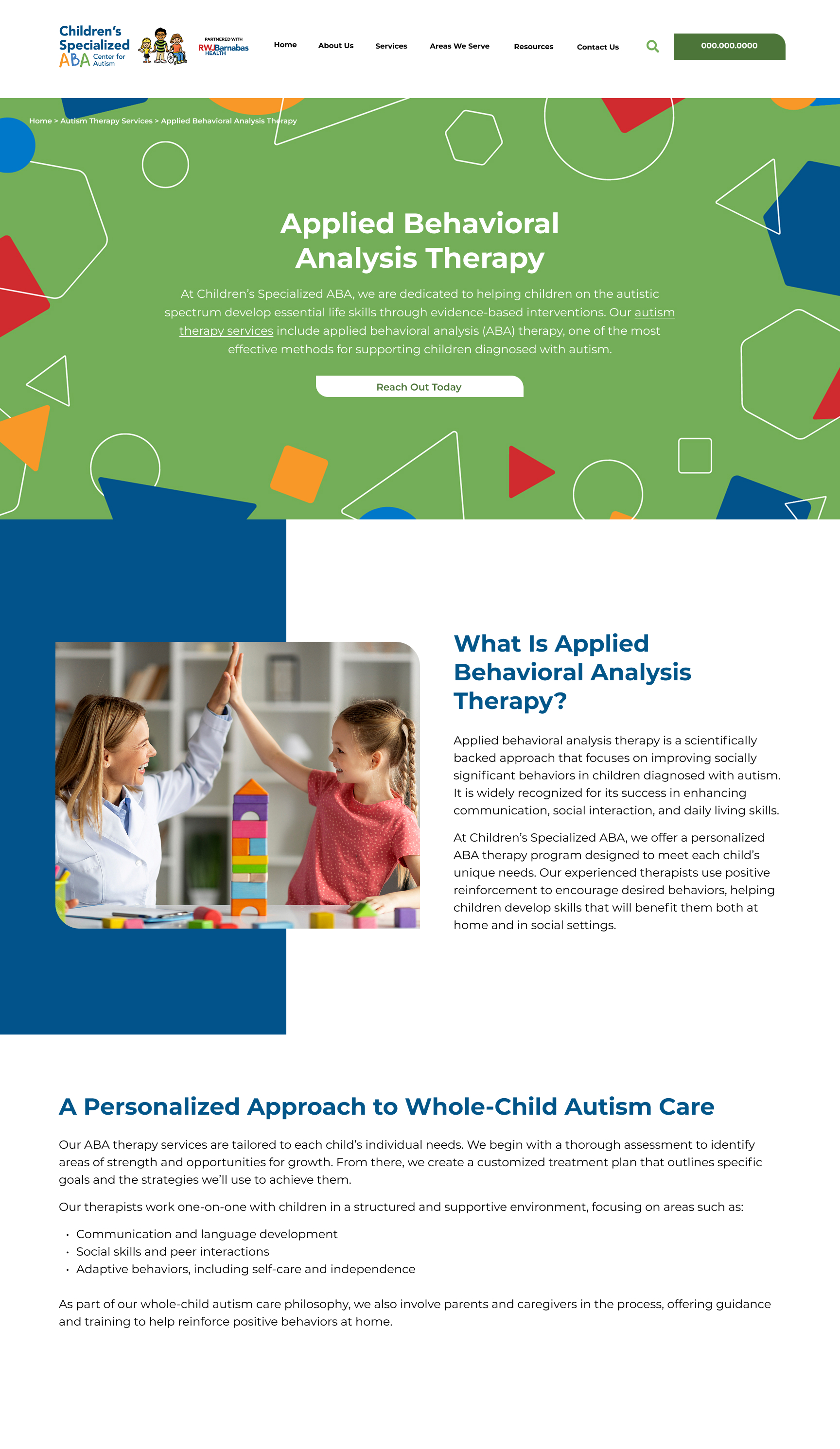 This client is an ABA facility. They wanted their site to be fun and interesting the both children and parents. Through multiple iterations of the wireframe and the brand guide within their company, we came to this design. On the right, is the last piece I was working on for them before my departure which was to update their hero and the page title area. Within the company they created these background that includes solid and outlines shapes. They requested this to be incorporated into the hero and page title areas of their website. To do this, I recreated the design but put them towards the edges to allow space for text and images without causing it to look too busy.