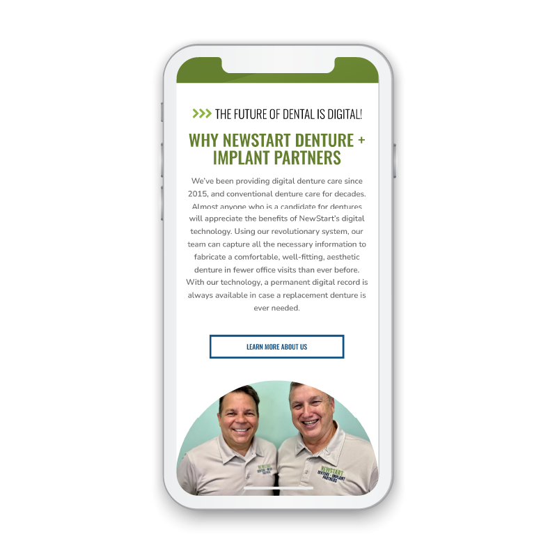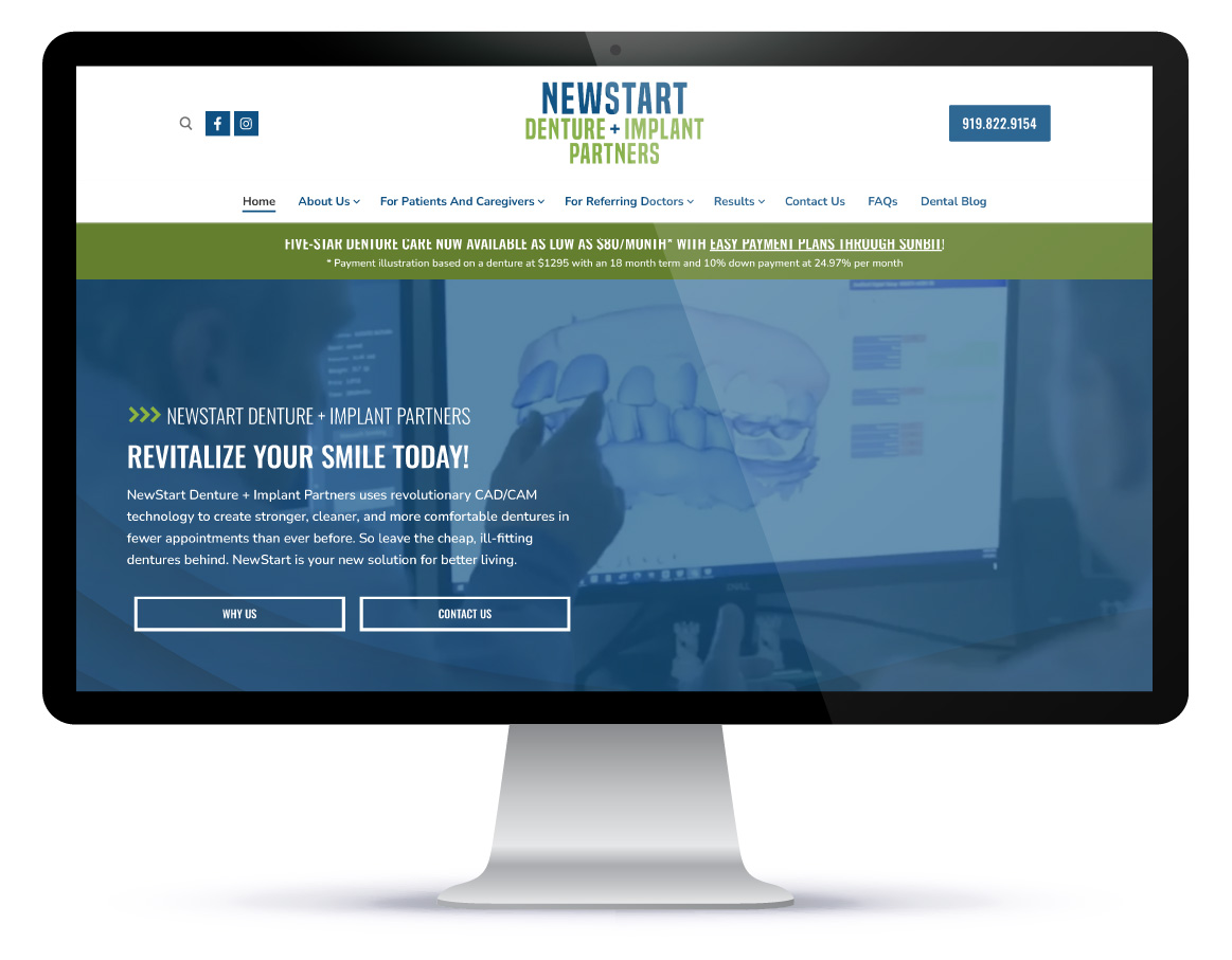 NewStart Denture + Implants is dental company that focuses on teeth restoration with their target demographic being middle age to seniors.